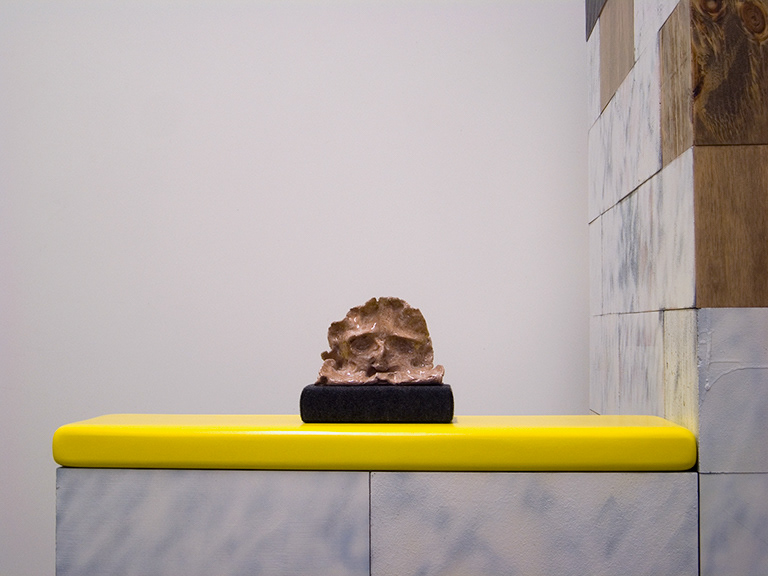 Blocks made from painted wood, particle board, and MDF. Ceramic sculpture found in a classroom garbage can, felt, MDF, and enamel.