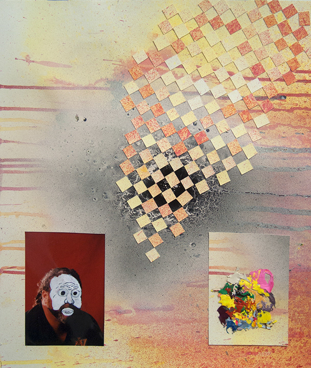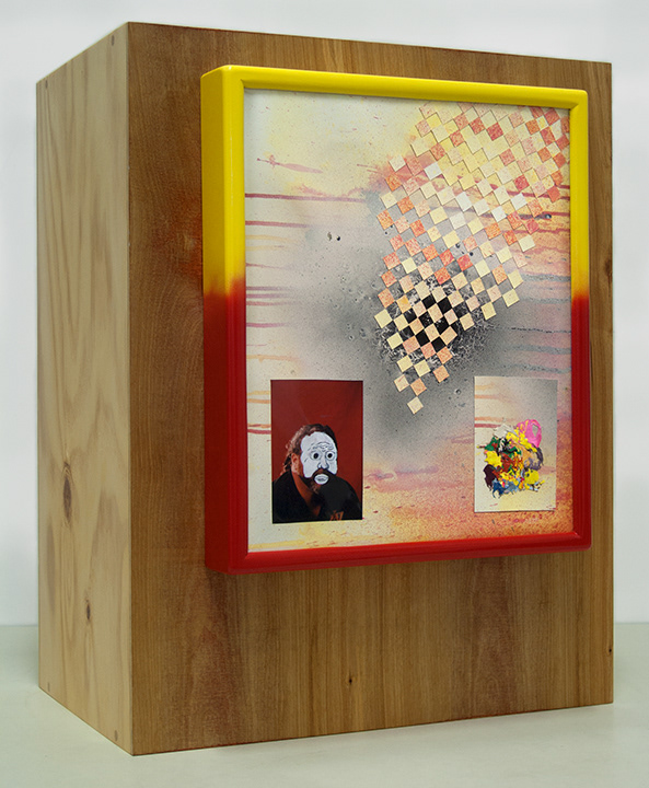 Found photograph, spray paint, acrylic paint, hand carved MDF frame, enamel, and wood.