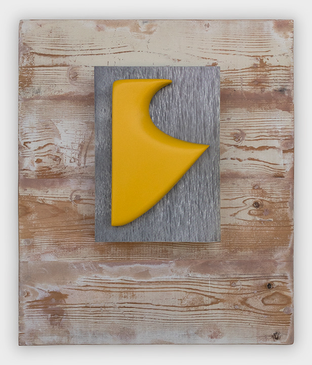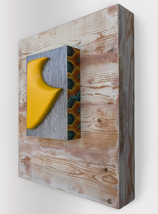 Garbage wood, bondo, primer, found print images, MDF, enamel.