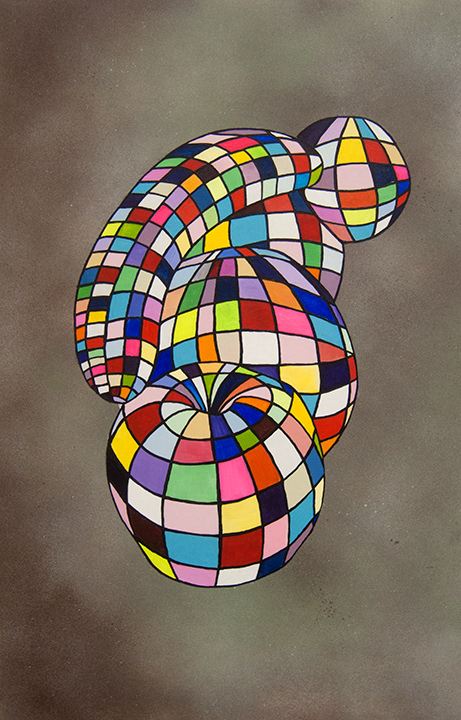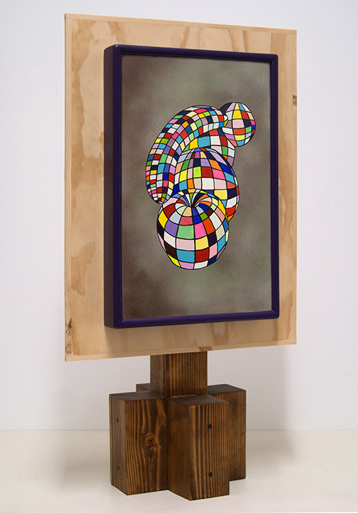 Acrylic on drawing assignment found in a trash can, spray paint on paper, hand carved MDF frame, enamel, and wood.