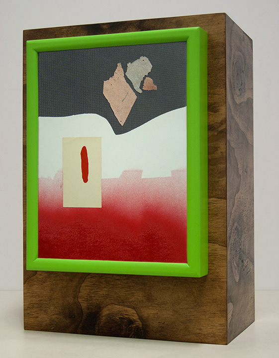 Acrylic, spray paint, crafting paper, notecard, paint skins, hand carved MDF frame, enamel, and wood.
